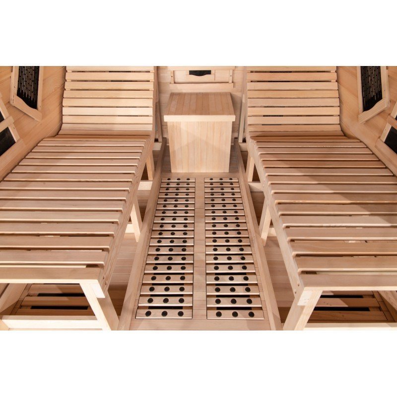 Das Design der Snö-Saunakabine ist äußerst hochwertig und sorgfältig verarbeitet. Die Seitenwände bestehen aus kanadischem Hemlockholz mit einer Stärke von 43 mm (6,5 mm + 30 mm + 6,5 mm). Die Sauna vereint zwei Arten von Infrarotheizsystemen: Keramikstrahler und Carbonstrahler. Die Keramikstrahler sorgen für eine schnellere Erwärmung der Kabine, während die Carbonstrahler eine gleichmäßigere Wärmeverteilung im gesamten Innenraum fördern. Beide Heizsysteme erwärmen die Haut direkt durch Strahlung. Die Infrarotwellen sind völlig ungefährlich – es handelt sich um dieselben Wellen, die in Brutkästen in Entbindungsstationen verwendet werden.