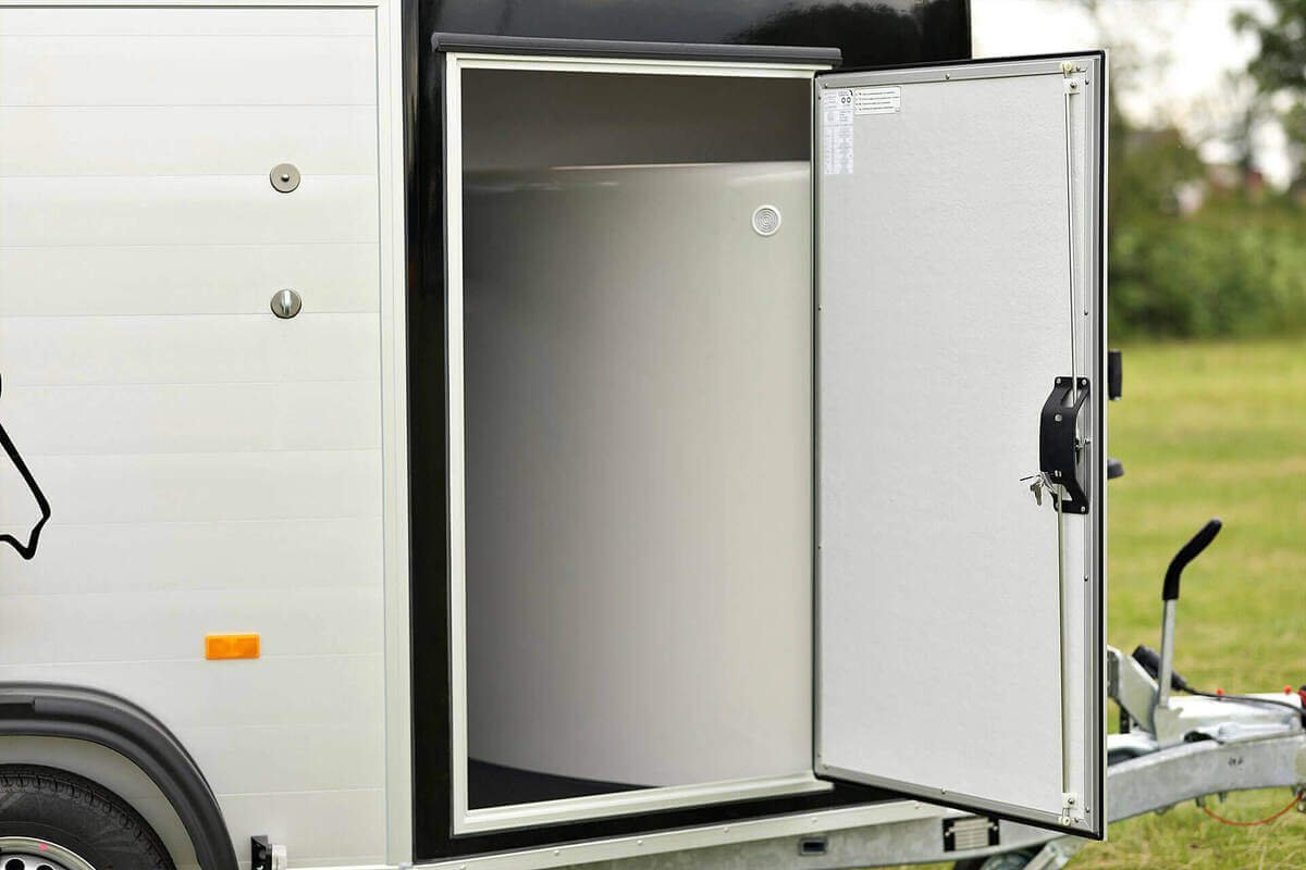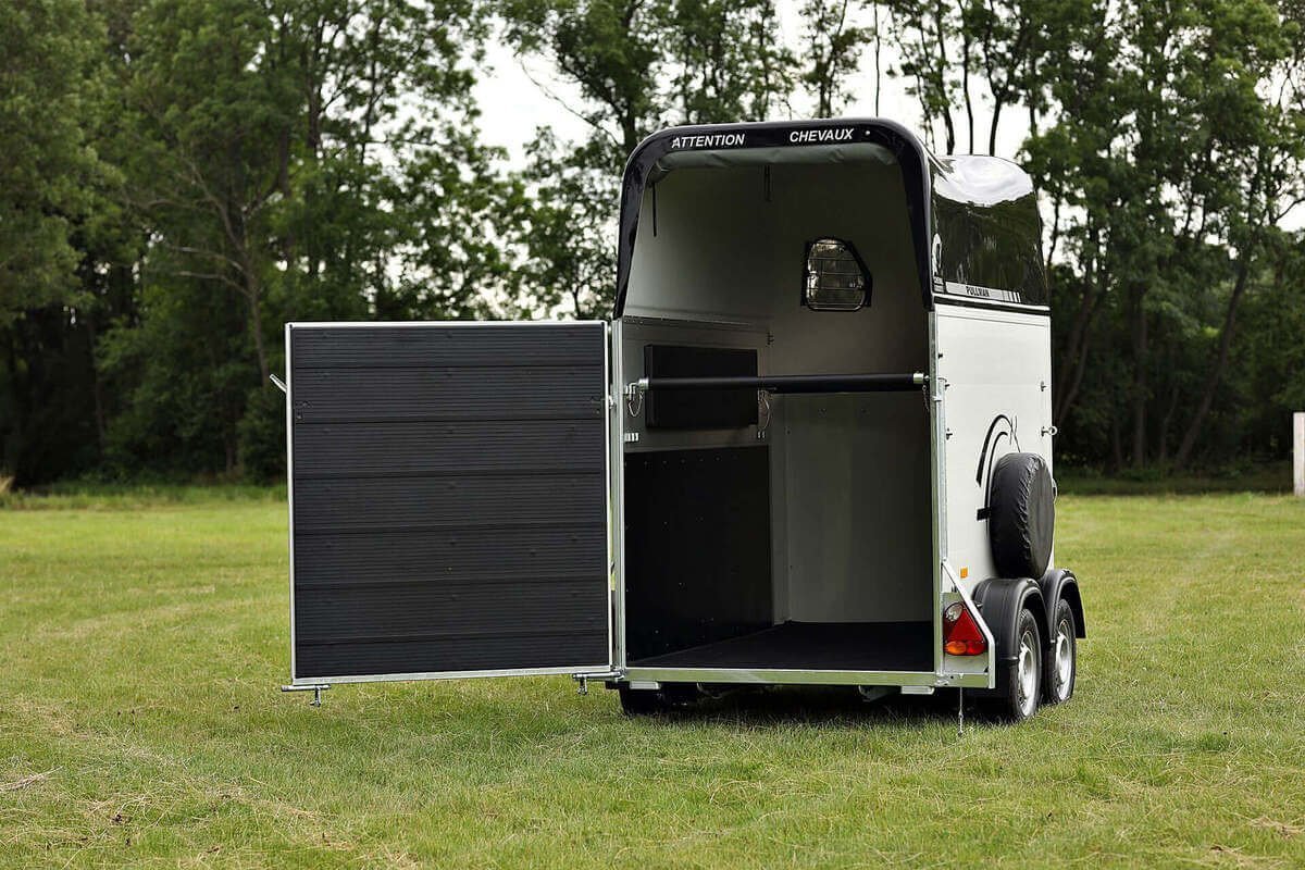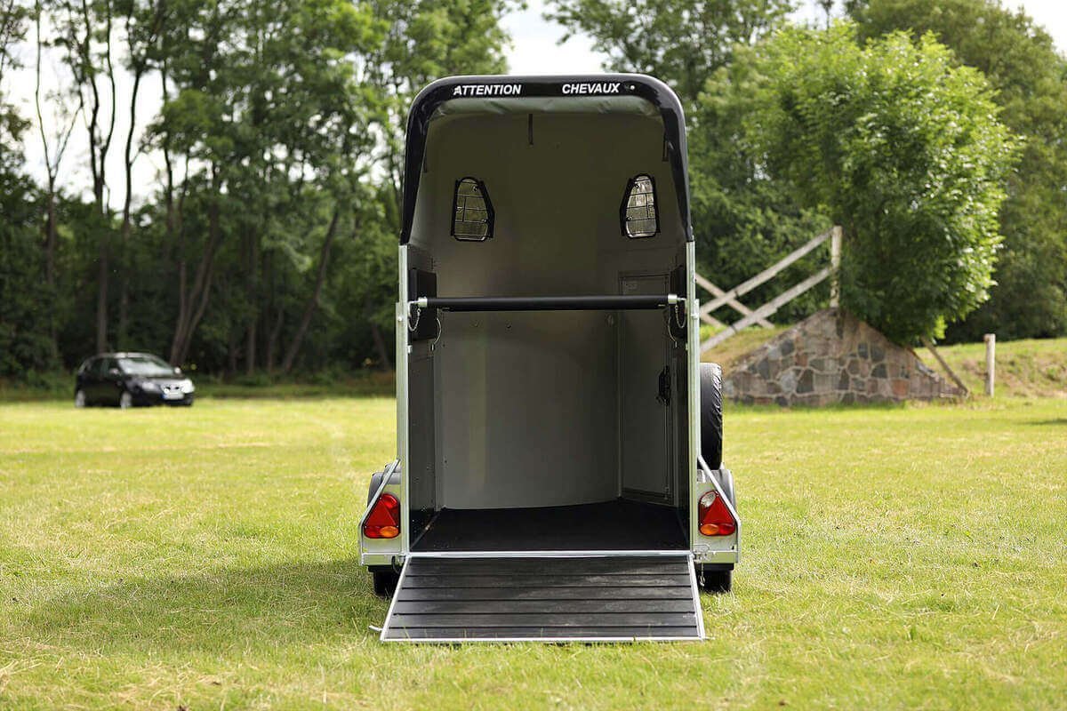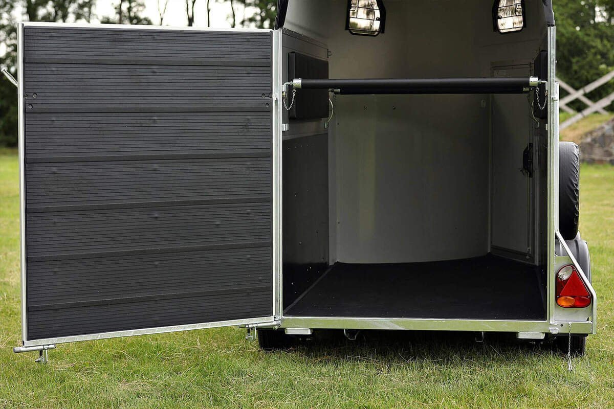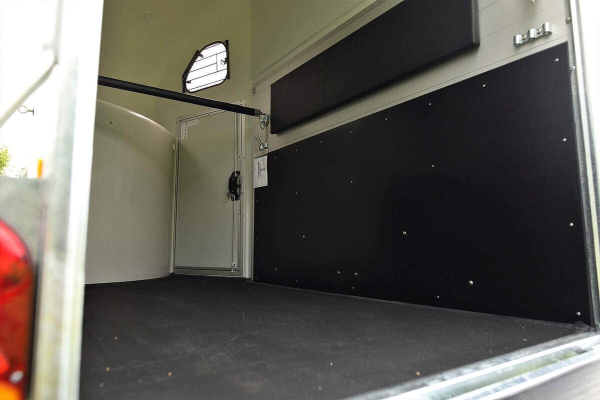 Ein weiteres wichtiges Merkmal ist die seitlich öffnende Rampentür, die aus finnischem Hartholz gefertigt ist. Dank der Verwendung hochwertiger Materialien ist der Anhänger besonders stabil und sicher. Zwei Frontfenster sorgen für eine sehr gute Belüftung im Inneren.