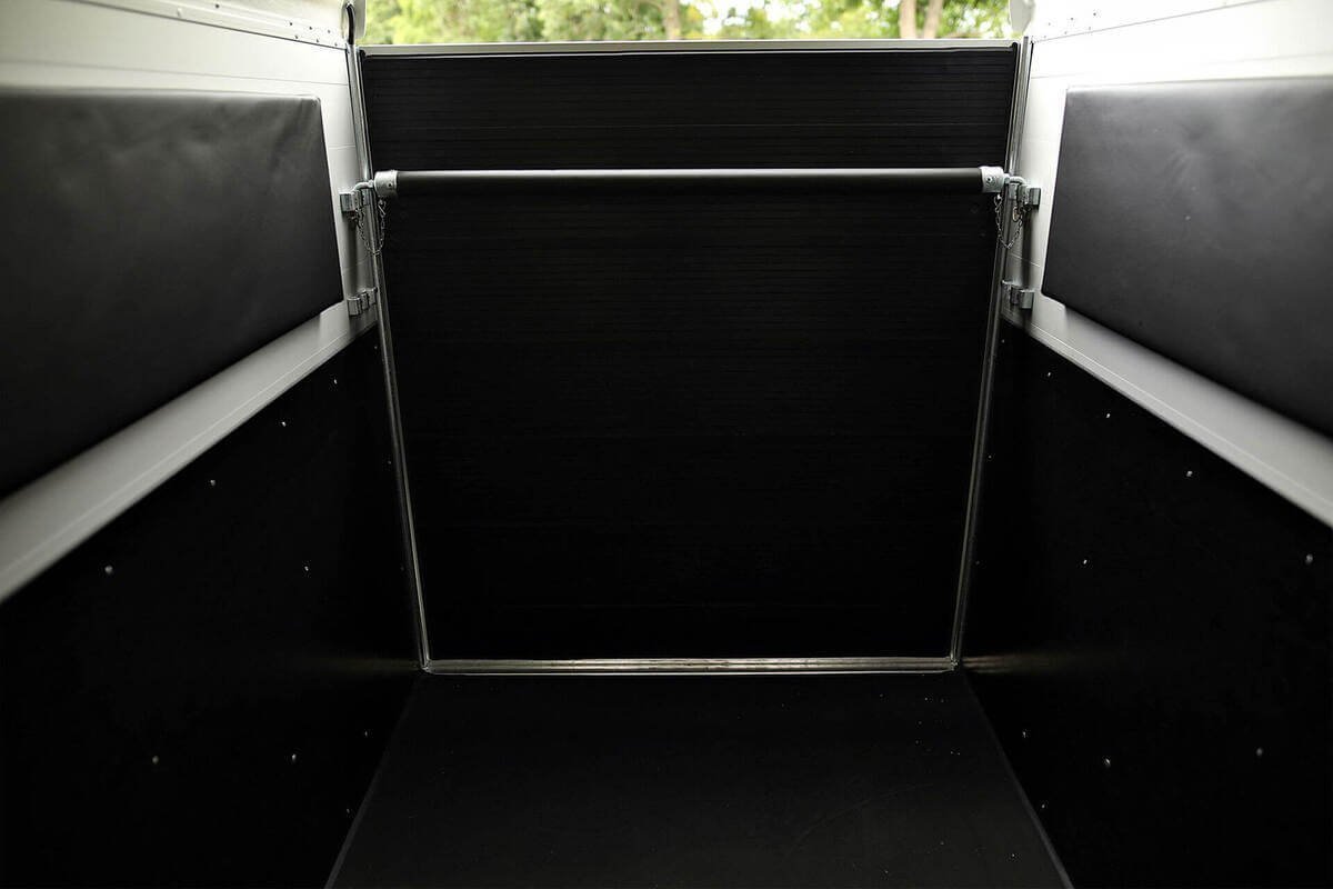 Zusätzlich verfügt dieser Anhänger über eine aufrollbare Heckplane mit automatischem Faltmechanismus – ideal bei Regen oder langen Fahrten. Als Extra kann eine seitliche Servicetür mit großem Sattelraum hinzugefügt werden, ausgestattet mit zwei Sattelhaltern, Futterbehälter und Spiegel.
